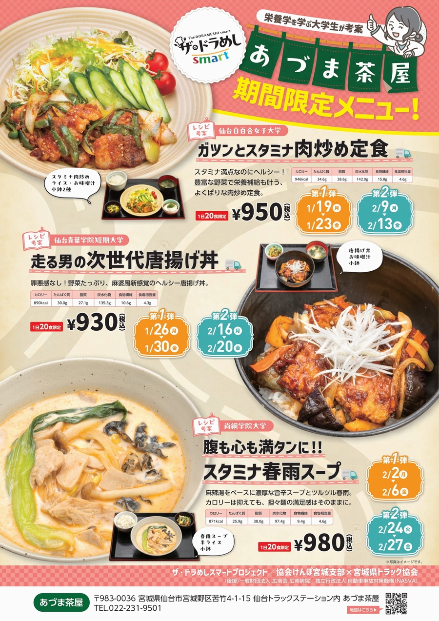 『ザ・ドラめしsmartプロジェクト』とは? 協会けんぽ宮城支部と宮城県トラック協会は、トラックドライバーの健康づくりを「食」の面から支援するプロジェクト『ザ・ドラめしsmartプロジェクト』をスタートさせました。 広南病院、自動車事故対策機構(ナスバ)仙台主管支所が後援として協力し、宮城県内の栄養学を学ぶ大学生と連携して「おいしい」「満足感がある」「健康に配慮した」メニュー開発等を行ったものです。 メニューは各大学ごとに週替わりで1日20食限定です。 ●協会けんぽ宮城支部が紹介する「ドラめしプロジェクト」のYouTube動画はこちらから |